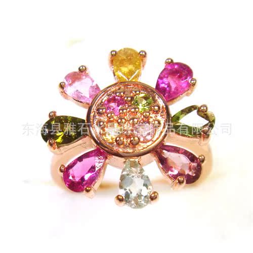 【名称】 925银镀玫瑰金天然彩色碧玺太阳花活扣戒指