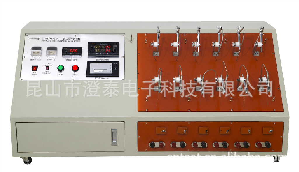 本机试法是将插头或插座正负极短接后,尾部接在电流输出接线柱上,然后接通电流,按标准要求设定好所需试验电流及时间后,测试插头或插座的插片与导体铆合处的温升数值在经过一定的时间及电流负载后的温升数值是否符合标准要求,并可自动打印记录测试温度。适用于端子温升试验和插头温升试验,具有两种试验模式: