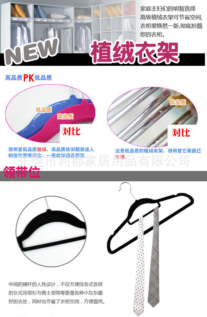 2. 防滑防落,植绒衣架的材质是ABS改性环保料,外层是色彩丰富,手感柔软的绒毛,经静电植绒机植上,再由高温处理.就是这层绒毛像魔术师的手一样有种无形的力量抓住衣服使衣服不滑落,不变形.