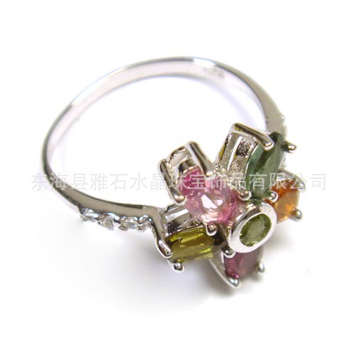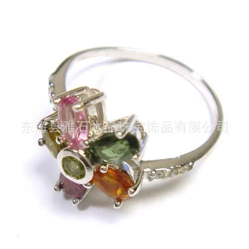 【名称】 925银镀白金天然彩色碧玺‘五星花’镶钻戒指
