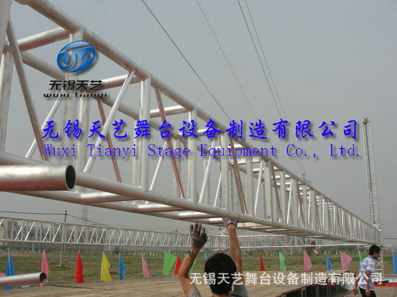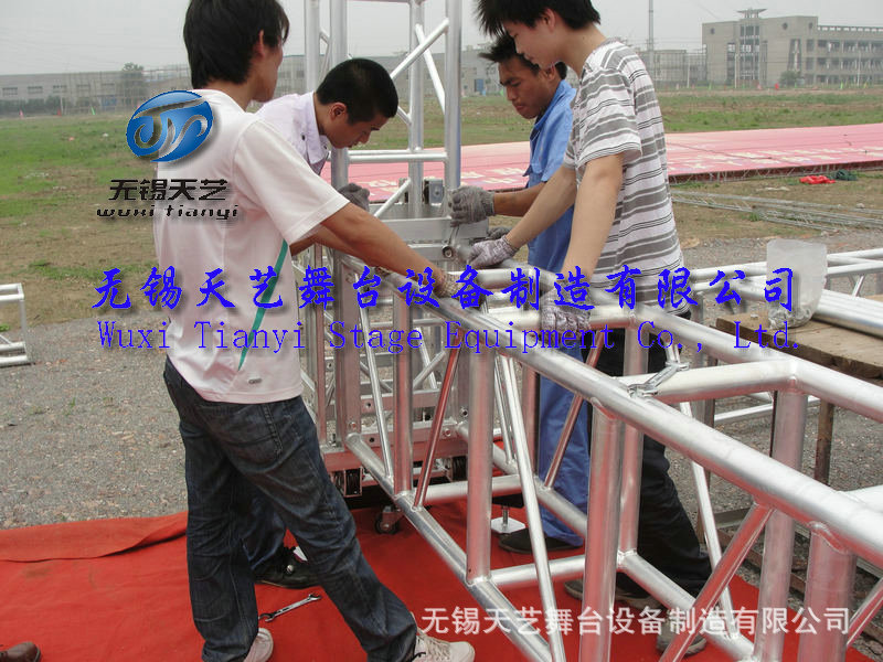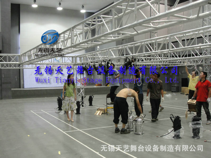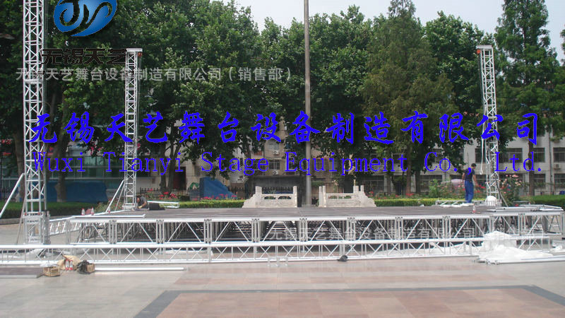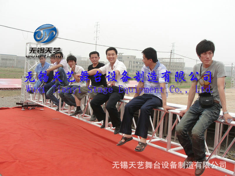 无锡天艺舞台设备制造有限公司是一家专业生产展览钢/铝桁架,钢/铝快装活动舞台,折叠舞台,玻璃舞台,展览篷房,铝合金灯光音响架,雷亚架,T台等广电传媒器材为一体的综合性的大型企业。公司位于国家级经济开发区 ,芙蓉工业园区A区蓉洋三路 32-1号,无锡东出口处8公里即可到公司,公司凭借着高质量的产品,良好的信誉,优质的服务,产品畅销全国近三十多个省、市、自治区以及远销南美、东南亚、欧美等国家。竭诚与国内外商家双赢合作,共同发展,共创辉煌。无锡天艺一直秉承“质量为首,服务为先,诚信为本”的经营理念,欢迎来公司参观洽谈。我们竭诚为您提供最优良的品质和最好的服务本公司始终坚持“以质量求生存为本”,本着“质量第一、信誉第一、竭诚服务、精益求精、不断创新”为宗旨,在国内市场奠定了良好的基础。为了更好的推行ISO质量管理体系,规范生产流程,严控把关产品质量,公司配备目前最先进的组装焊接与机械加工设备,流水线式的生产,不断提高生产技术和质量,确保以最优质的产品来满足客户的需求。