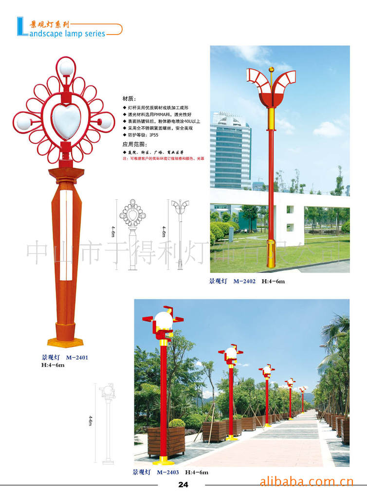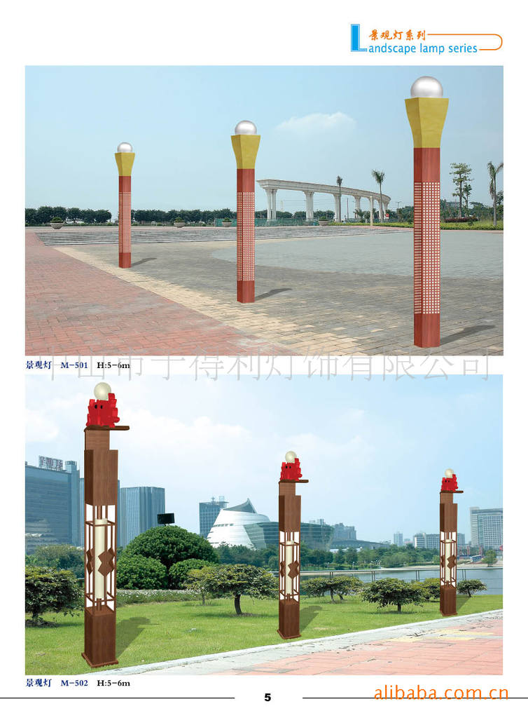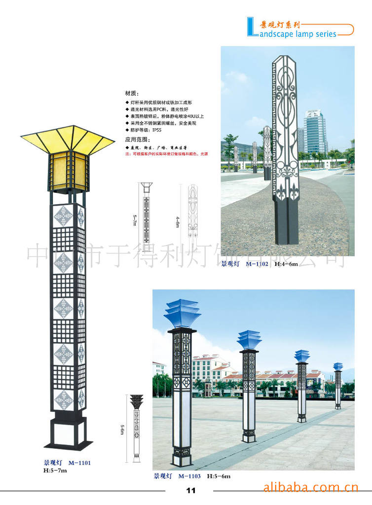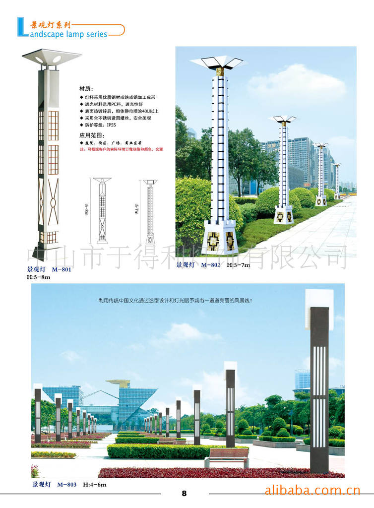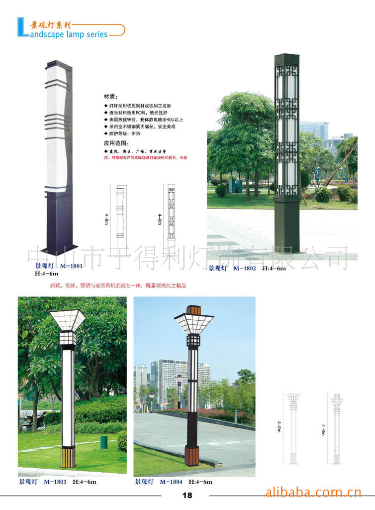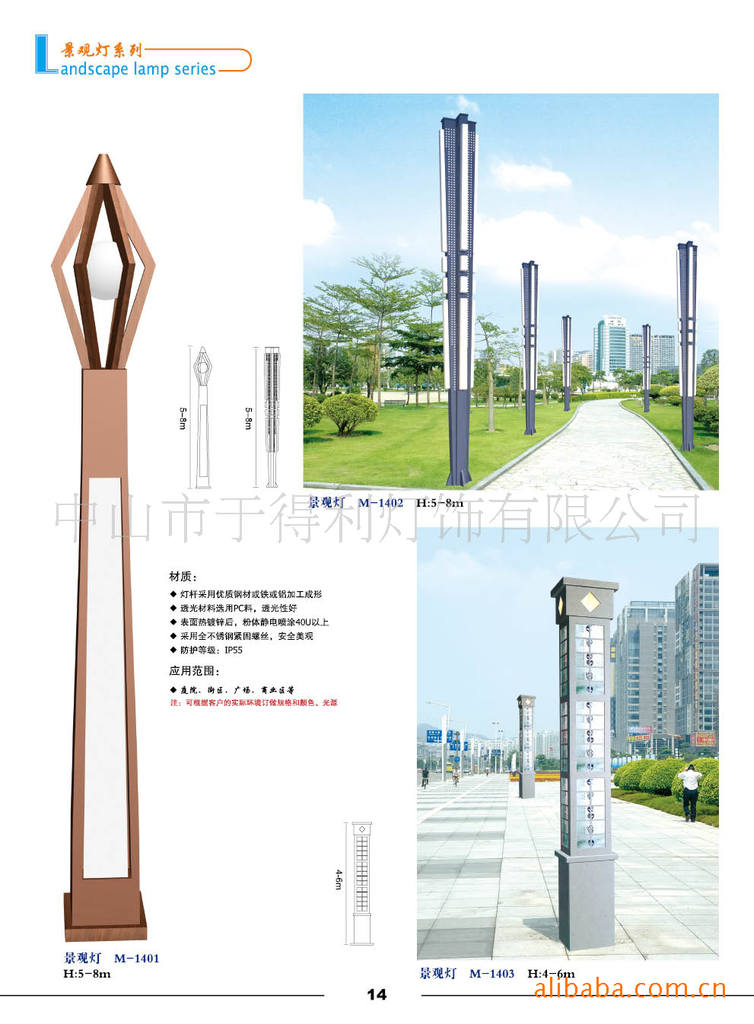 产品名称:景观灯 详细说明:特点:造型精简大方,为装饰性景观照明灯饰具有很强的夜景装饰效果 适用场所:公共场所、街区、步行道、广场等 光源:LED光源,金卤灯,T4,T5,节能灯 等。 防护等级:灯具防护等级IP55 材料说明:灯柱为不锈钢,铝材制品,(优质钢材,经热镀锌处理后),表面聚肪粉体涂装 灯罩为PMMA 紧固件螺钉、螺母为不锈钢 特别说明:基础预埋需按本公司要求制作 打开电器箱门需用本公司专用扳手 安装时必须保证灯体安全接地 线体为1.5平方BVVB-300/500双层护套线。