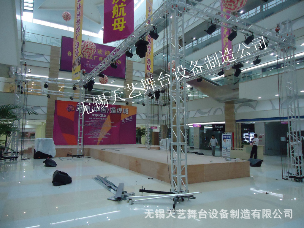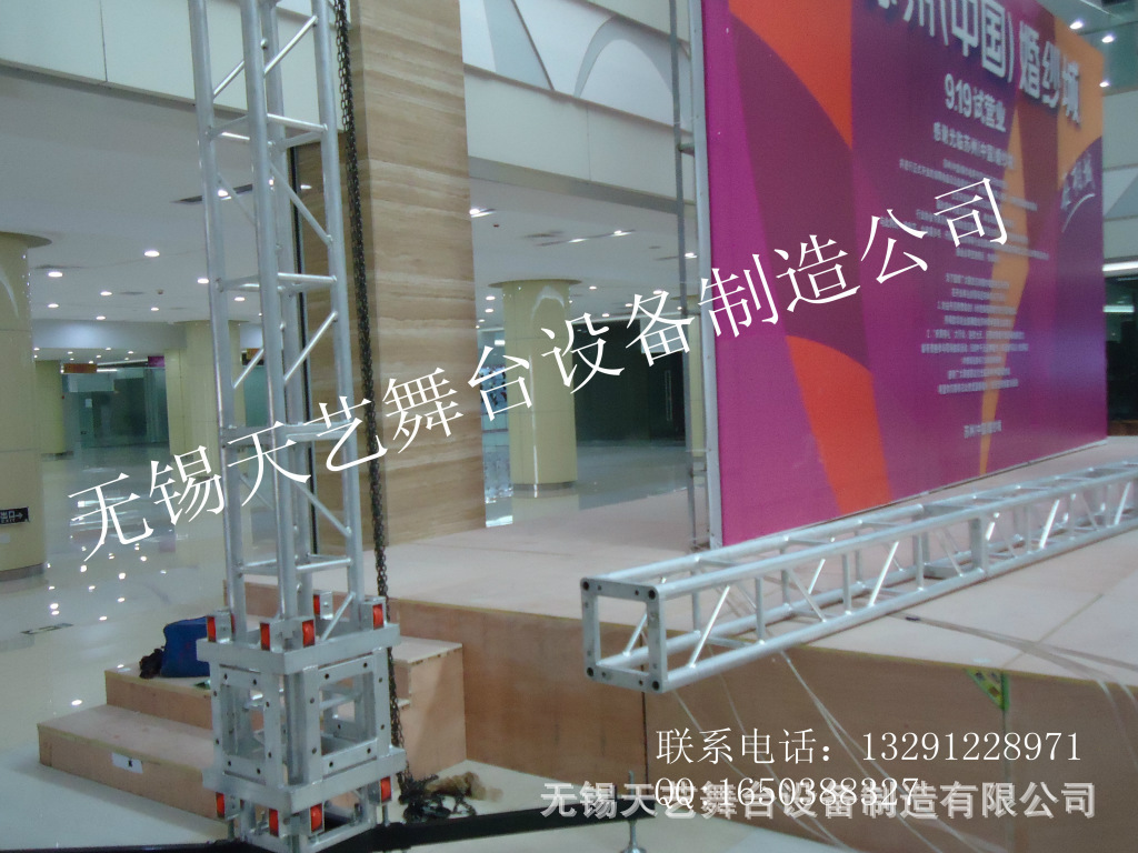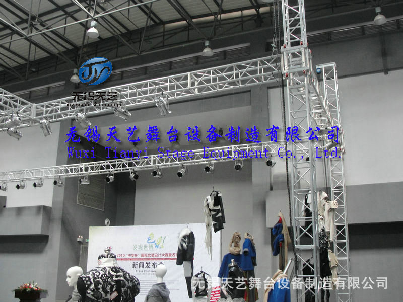 无锡天艺舞台设备制造有限公司是一家以专业生产展览钢制桁架,快装活动舞台,铝合金桁架,铝合金灯光架,雷亚架,A字架,铝合金舞台,玻璃舞台,折叠舞台,展览篷房T台为一体的综合性的大型生产企业。公司位于锡山经济开发区。公司拥有成熟的销售团队,竭诚为您提供最优质的服务,拥有最强大的技术和设备支持,全力为您打造质量最精的产品,公司秉承“质量为首,服务为先,诚信为本”的经营理念,立志在行业内创出辉煌!争创行业第一!欢迎来厂参观洽谈。我们竭诚为您提供最优良的品质和最好的服务。
