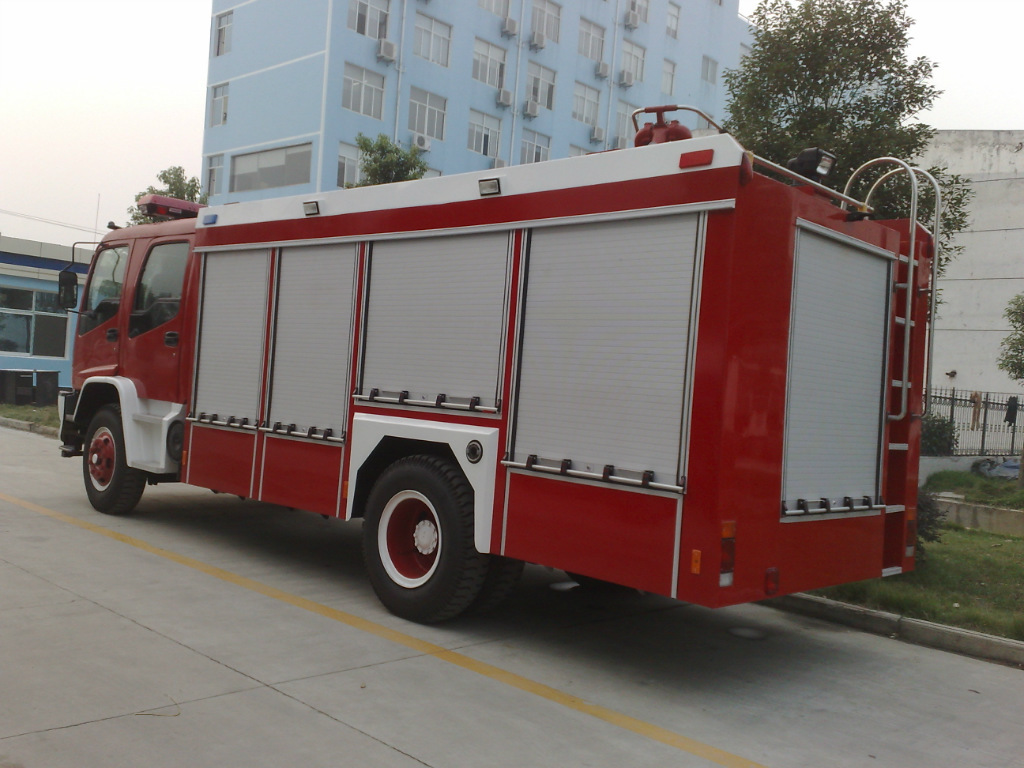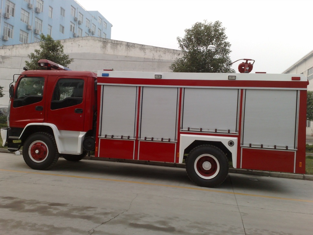 ★消防车又名灭火车、救火车。采用二类载货汽车底盘改装而成,专用部分由液罐、泵室、器材箱、动力输出及传动系统、管路系统、电气系统等组成,广泛适用于城镇公安消防队、石油化工、厂矿企业、社区、森林、港口、码头等部门,可迅速接近火场展开灭火战斗,扑救各种火灾,是理想的消防装备。