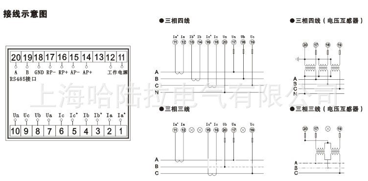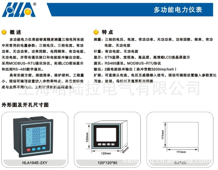 多功能电力仪表能够高精度测量三相电网系统中所常用的电量参数:三相电压、三相电流、有功功率、无功功率、功率因数、电网频率、有功电能、无功电能,并带有通讯接口和电能脉冲输出功能。采用MODBUS-RTU通讯协议,实现LED现场显示和远程RS-485数字通讯。