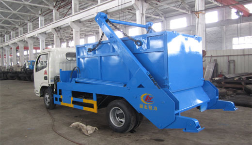 ★挂桶式垃圾车(也叫自装卸式垃圾车):采用链条和液压油缸联动装置,实现对垃圾半提升和翻转,将多处垃圾斗内的垃圾自动收入车厢,并可自卸。
