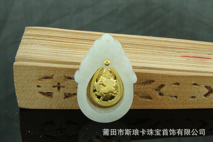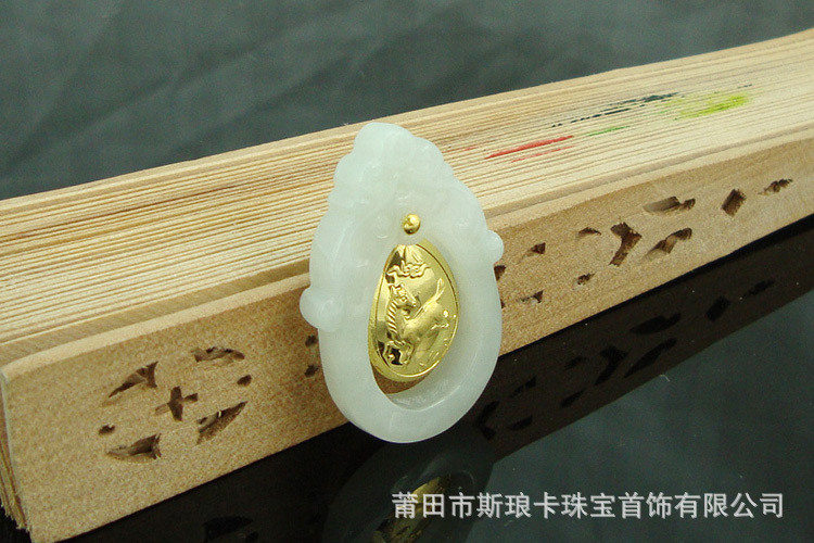【金镶玉介绍】 自古以来,翡翠一直是最受人们喜爱的珠宝之一。翡翠的绿色与红色象征幸福与兴旺。人们佩戴翡翠饰物,可以防身避祸,逢凶化吉,祛病延年。赠送和佩戴翡翠饰物,预示着对爱情的忠贞。优质翡翠是当今世界价格昂贵的宝石品种,是高档玉料。同时也是高档工艺品“金镶玉”的最好原材料。“金镶玉”产品既倡导时尚,又弘扬传统;玉石与金属的巧妙结合,彰显了“玉”的高贵品质,同时也喻示了中国传统文化中的“金玉良缘”,象征无限美好。产品以优质玉石为原材料,嵌入黄金,经多道工艺精琢而成。