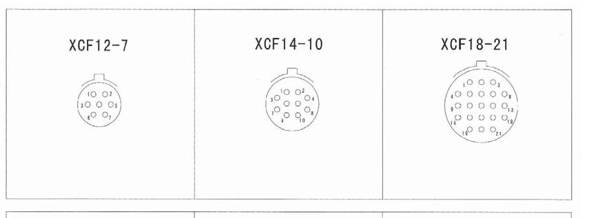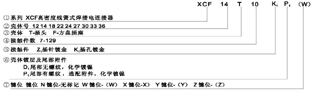 例如:XCF系列14型装镀金插孔插座,接触件芯数为10芯,壳体化学镀镍,N键位
