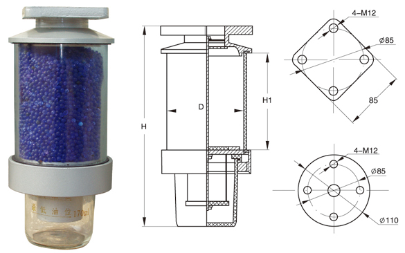 吸湿器又名呼吸器,用于清除和干燥由于变压器油温的变化而进入变压器(或互感器)储油柜的空气中的杂物和潮气,以保证变压器油的绝缘强度。吸湿器按硅胶可分为白色硅胶吸湿器和变色硅胶吸湿器;按功能可分为普通(或单吸)吸湿器和双呼吸吸湿器。吸湿器硅胶颜色为:白色、蓝色两种型号:0.1kg、0.2kg、0.5kg、1kg、2kg、3kg、5kg、10kg