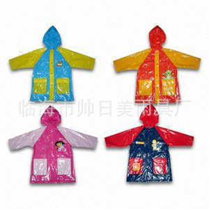 我厂专业研发生产环保面料高档PE、PEVA、EVA薄膜,雨衣,EVA时尚雨衣,印花雨衣,浙江临海雨具工厂,工厂从面料到成品一条龙生产,拥有多条国际最先进的流水生产线,可定做客户指定的厚度、颜色及规格尺寸等要求。本厂生产的PE、PEVA或者EVA薄膜,表面有磨砂、布纹、钻石纹、半透明、全透明等可供选择,产品广泛用于雨衣、雨披、雨伞、台布、浴帽、浴帘、薄膜袋、购物袋、围裙、口水巾、围兜、护理垫、失禁垫、产褥垫、急救垫、宠物垫、卫生巾,汽车脚垫等,面料可以加天然香水,薄膜可以印刷、车缝、高频热合,复合等,面料可以加天然香水,薄膜可以印刷、车缝、高频热合,复合等。薄膜具有无毒、无味、质轻色艳(密度为0.925克/立方厘米)手感滑爽等特点,是新型可回收的环保材料。
