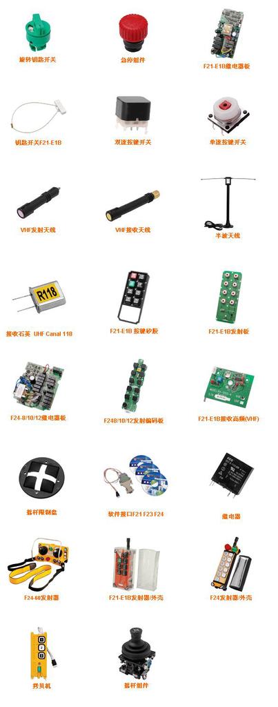 本公司可为客户提供工业遥控器外壳、天线、急停按钮、按键、旋转开关、启动开关、按钮附件、磁性开关、钥匙、变压器、晶振、主板、发射板、防水套、保护套、编程软件、编程电缆、拷贝机、减震座、摇杆、钥匙开关、背带、发射器外壳、接收机外壳等。