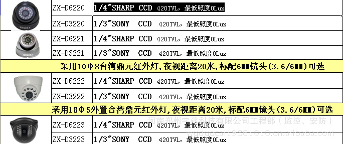1/4"SHARP CCD 420TVL,最低照度0Lux以上产品按实际参数及外观为准,所有入库产品都经过24小时通电测试