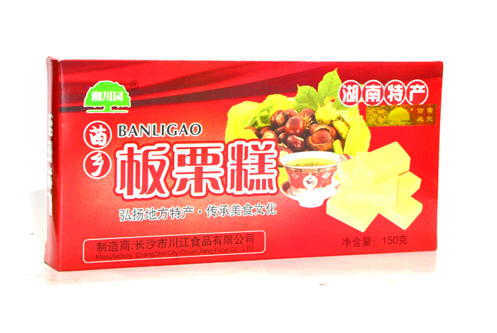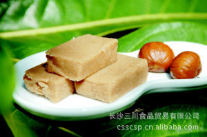 [制法]板栗水煮30分钟,待冷去皮,放碗中,上笼蒸30分钟取出,方口白糖,压成栗子泥,放入搪瓷盘内,切成4厘米长、3厘米宽的块即成。