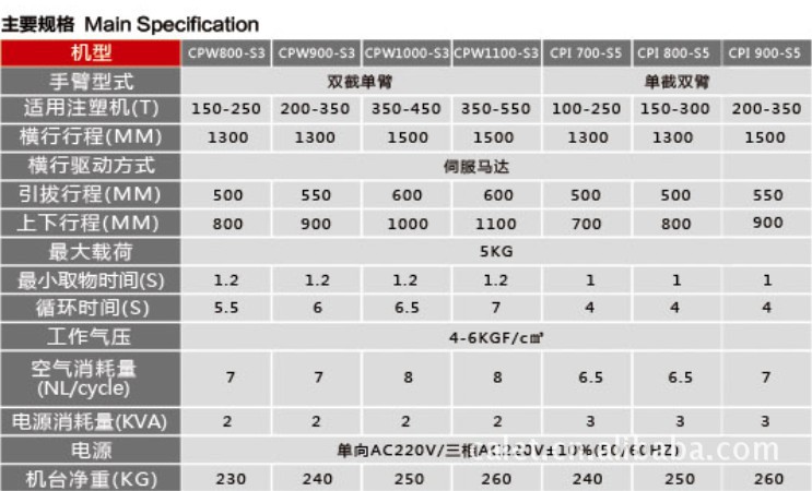 CP系列适用于50-550吨的各式卧式注塑机。手臂有单截式和双截式;上下行程700-1100mm。