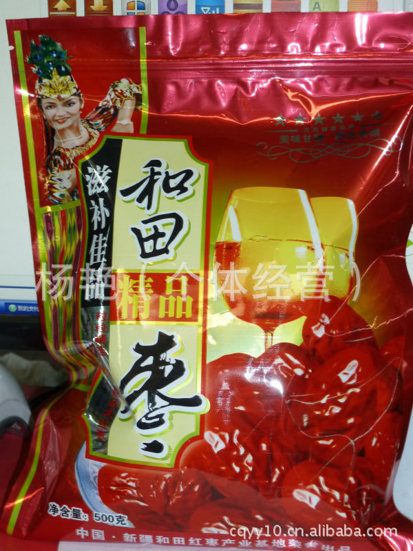 和田的大枣,全国的大枣,肉非常厚,核很小,口感较甜!可以煲汤,熬粥,泡茶或直接吃!很好的食补品。 大枣所含营养丰富。它含蛋白质、脂肪、糖类、纤维素;红枣营养十分丰富。维生素C含量在水果中名列前茅,每百克含量达0.l-0.6克,比苹果、桃子等高100倍左右,维生素P的含量也是百果之冠,人们赞大枣是“天然的维生素-丸”。人们历来就把红枣视为极佳的滋补品. 常见问题: