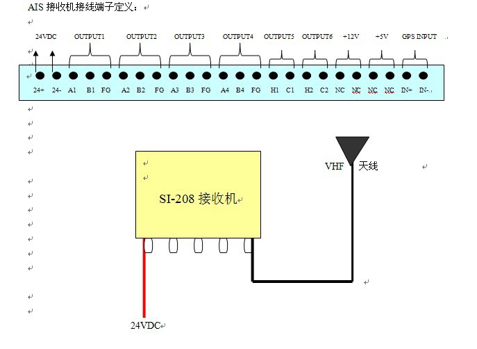 输出AIS信号: 四路RS-422(A1 B1; A2 B2; A3 B3; A4 B4),FG为地。