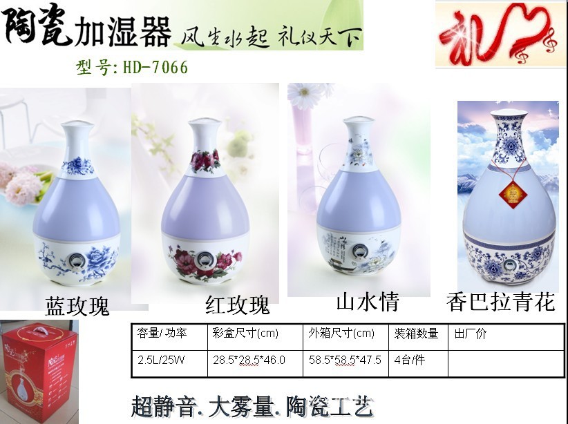 1、陶瓷加湿器是集喷泉、灯饰、水族、艺术于一体,更是一台时尚的室内氧吧,具有无与伦比的观赏性和收藏价值。