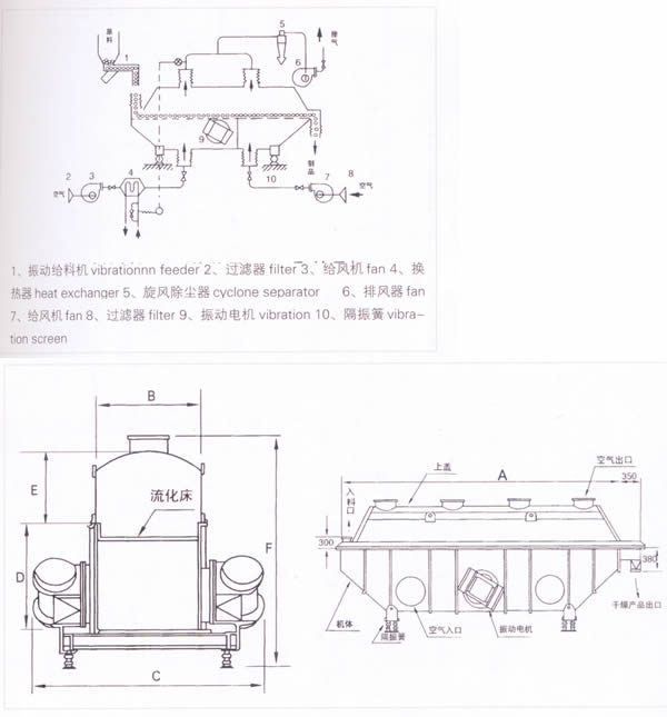 原理 物料自进料口进入机内,在振动力作用下,物料沿水平方向抛掷向前连续运动,热风向上穿过流化床同湿物料换热后,湿空气经旋风分离器除尘后由排风口排出,干燥物料由排料口排出。