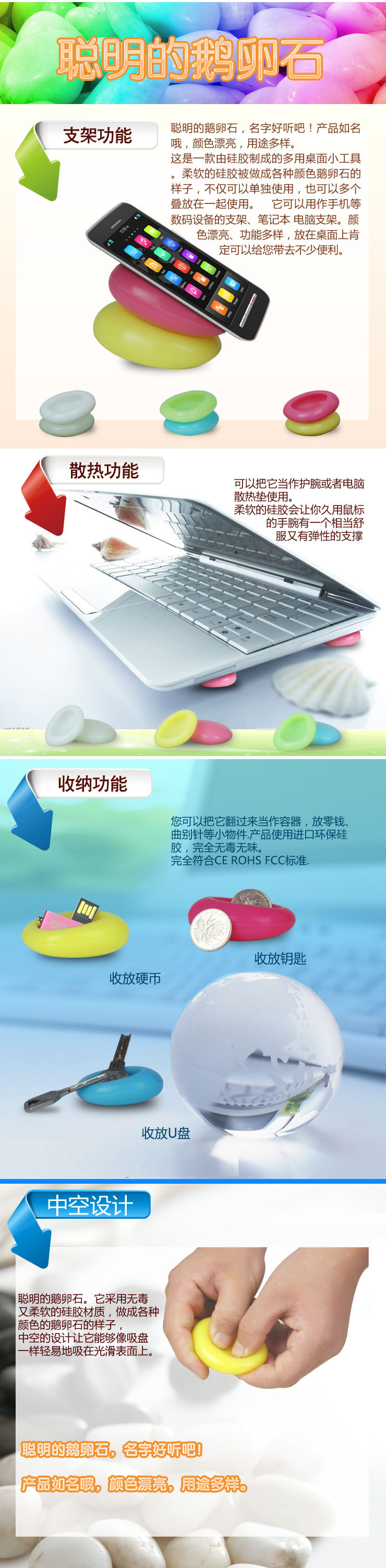 这是一款由硅胶制成的多用桌面小工具。柔软的硅胶被做成各种颜色鹅卵石的样子,并采用了中空设计,可以像吸盘一样轻易吸附在光滑表面上。不仅可以单 独使用,也可以多个叠放在一起使用。您可以把它翻过来当作容器,放零钱、曲别针等小物件,还可以把它当作护腕或者电脑散热垫使用。这款产品颜色漂亮、功能 多样,放在桌面上肯定可以给您带去不少便利。