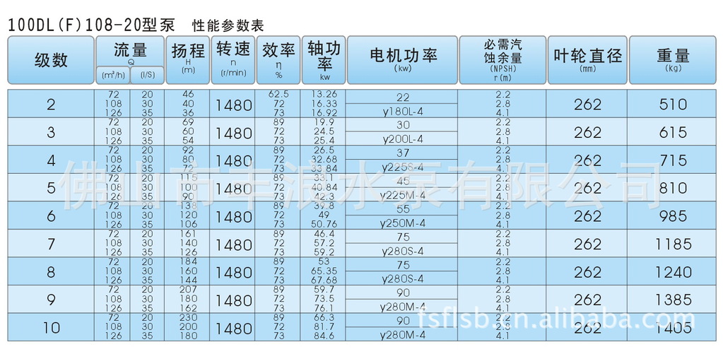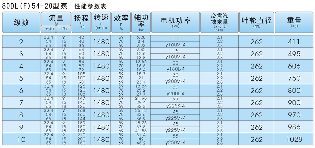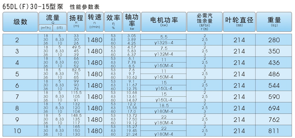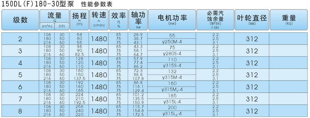 DL(F)泵的主要零件有:进水段、中段、出水段、电机座、叶轮、导叶、末级导叶、轴、轴套、密封环、上轴承、下轴承、档套等。