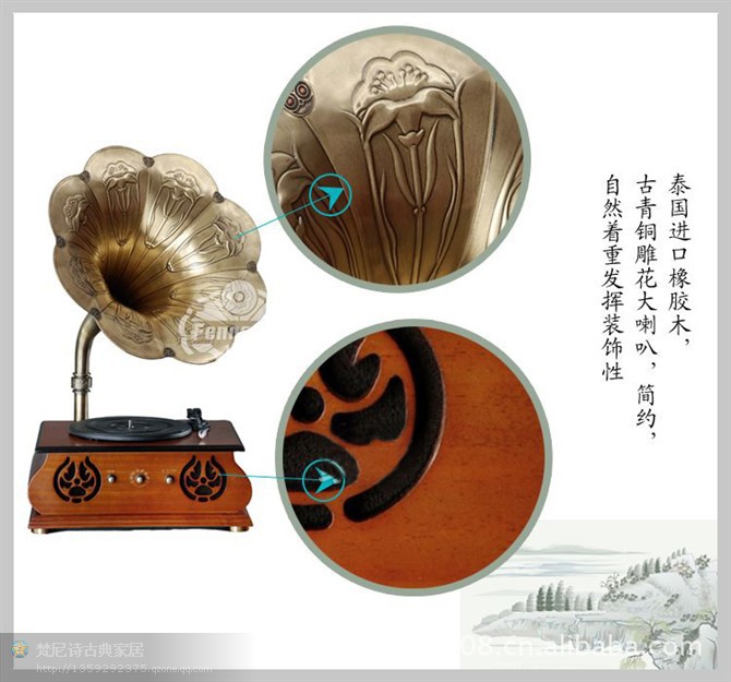 特点:泰国进口橡胶木,古青铜雕花大喇叭,简约,自然着重发挥装饰性,是酒吧,咖啡厅,会所首选的装饰摆件。