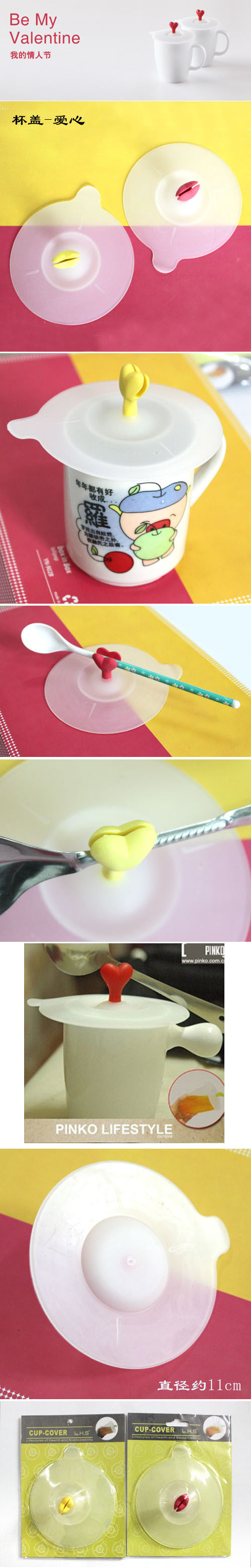 [商品名称]:爱心神奇防漏杯盖 材料:硅胶 尺寸:直径约11cm 包装:吸卡