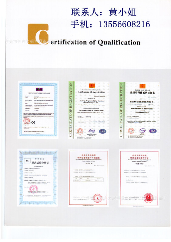 1.5T 1T 2T 3T 5T 10T 20T 25T 30T 50T 60T 环链电动葫芦安装使用:葫芦单梁,桥式起重机,门式起重机,悬挂起重机上.捎加改造,还可以作卷扬用.因此,电动葫芦是工厂、矿山、港口、仓库、货场、商店等常用的起重设备之一,是提高劳动效率。改善劳动条件的必备机械。