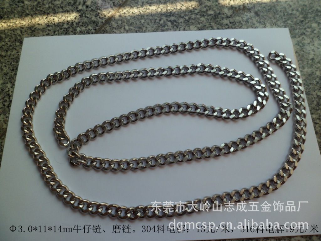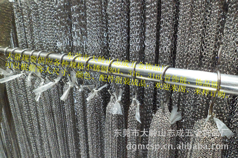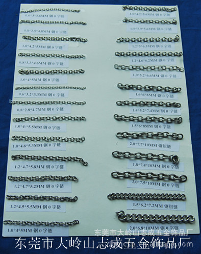 愿志成饰品能够美化您的生活,助您事业辉煌! 热忱欢迎您的垂询!主营产品/服务:专业生产;一:各种规格不锈钢机织链,焊口链;钢钛链;铜链、铁链、铝链等装饰链。 二:各种规格201、304、316、316L不锈钢开口圈、线割圈、锯口圈。铜开口圈、铁开口圈等圈仔。 三:各种规格201、304、316、316L不锈钢钥匙扣、。铜钥匙扣、铁钥匙扣等匙圈。 四:各种规格201、304、316、316L不锈钢全孖圈、半孖圈、铜孖圈、铁孖圈等孖圈。 五:各种规格201、304、316、316L不锈钢方线扣、扁线扣、圆线扣、朱胆扣等线扣。 六:各种规格201、304、316、316L不锈钢冲压链,冲压配件;龙虾扣、手工链等配件。承接各种规格201、304、316、316L不锈钢成品链,半成品链;品质优良,价格合理,欢迎国内外客商来样来料订购。我们将杰诚为你服务!