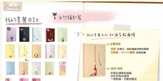 [我的美丽日记]面膜系列,藉由独特先进的奈米技术,短时间内让肌肤吸收完整营养,并长时间维持柔嫩及光泽。