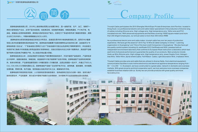 东莞市胜牌电线电缆有限公司(Triumph Cable Co., Ltd)胜牌电线主要产品有PVC电子线,高温电子线,HID硅胶线,UL电子线,CCC电子线。是一家集研发、生产、销售、工程服务于一体的电子线高科技企业。胜牌电线(原承兴电线)现拥有合作伙伴近200人,其中专业技术人才40多人,厂房建筑面积20000多平方米。