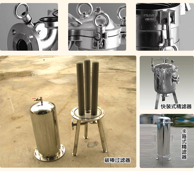 精密过滤器(又称作保安过滤器),筒体外壳一般采用不锈钢材质制造,内部采用PP熔喷、线烧、折叠、钛滤芯、活性炭滤芯等管状滤芯作为过滤元件,根据不同的过滤介质及设计工艺选择不同的过滤元件,以达到出水水质的要求。机体也可选用快装式,以方便快捷的更换滤芯及清洗。该设备广泛应用于制药、化工、食品、饮料、水处理、酿造、石油、印染、环保等行业,是各类液体过滤、澄清、提纯处理的理想设备。
