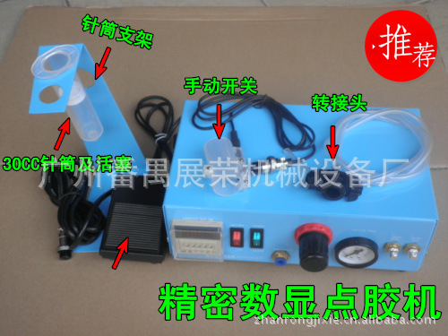 自动方式:把“手动/自动”选择开关拔至自动/I,此时“自动指示灯”(绿色)亮;可通过调节点胶时间控制点液量;动作流程:踩一下“脚踏开关”------针筒出胶------到达点胶时间-----出胶停止.