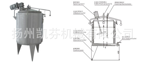 1.设备主要同筒体、夹套和外包皮三部分组成外包皮与夹套间填充保温介质,罐体顶部带搅拌器。
