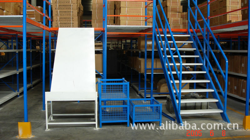 利用货架作为主体,楼面板通常选用冷轧型钢楼板,互扣式结构,楼面板与楼板梁之间采用锁紧机构锁定,与传统花纹钢楼板或钢格栅楼板相比,它具有承载能力强、整体性好、承载均匀性好、精度高、表面平整、易锁定等优势,并且易匹配照明系统,存取、管理均较为方便。单元货架每层载重量通常在500kg以内,楼面板承载通常在每平方米300-1000公斤之间。楼层间距通常为2.2m~2.7m,顶层货架高度一般为2m左右,充分考虑人机操作的便利性。通常配设楼梯、液压升降台或电梯,或由叉车将货物运至楼上。安装、拆卸方便灵活,可根据场地和需要,灵活设计成二层、三层阁楼,充分利用空间