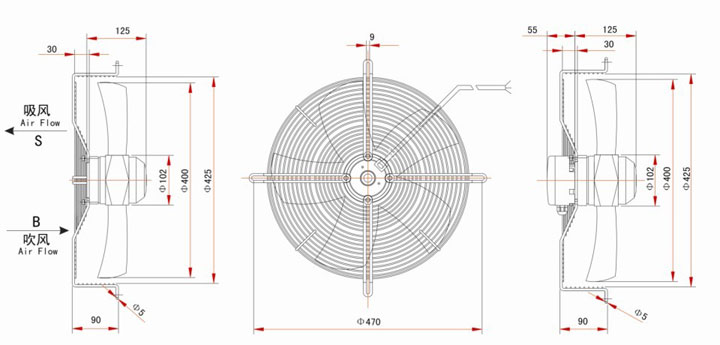 风机分为单相和三相运转两种。风向有吹风和吸风。多种网罩,导风筒,面板可选配。接线方式:直接出线1.5米或接线盒。