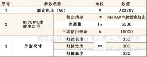 - 选用高效MH气体放电作光源,光效高,平均使用寿命在10000小时以上。