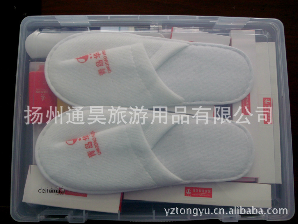 扬州通昊旅游用品有限公司专业酒店、宾馆一次性配套用品、品种有牙具、梳子、香皂、拖鞋、淋浴液、洗发液、擦鞋布、擦鞋器、棉签、针线包、剃须刀、杯盖、杯垫、圆珠笔、夹纸笔、火柴、垃圾袋、茶叶、床单、毛巾等,本公司竭诚为您服务。