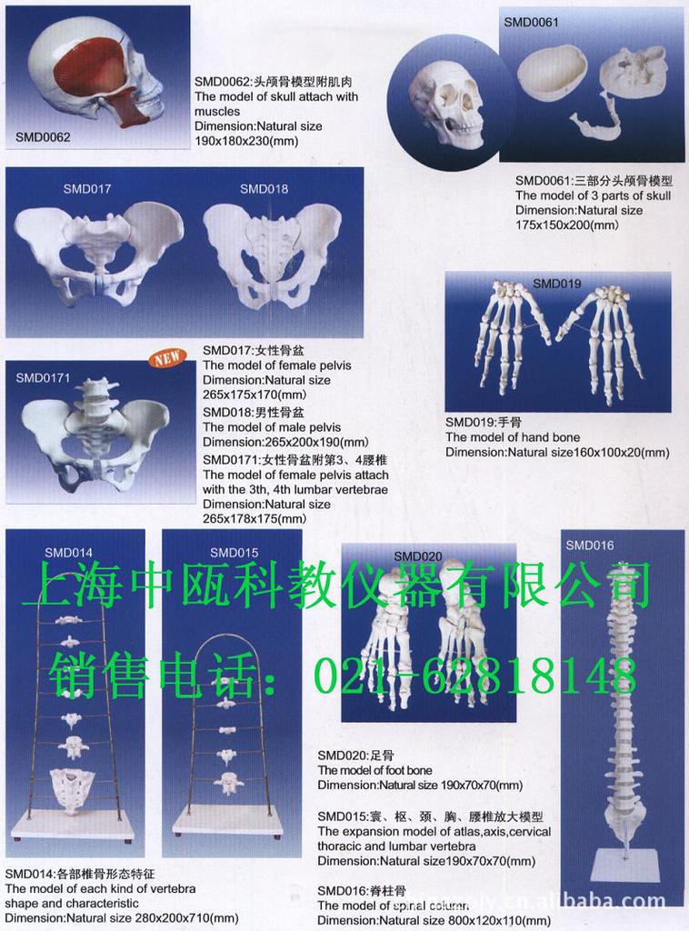 B015 | SMD003 | 人体骨骼模型 | 高:850 | 运动系统,示全身骨骼,附起止点着色,串制直立 | 台 | 450 | 按标本1/2倍倍制造 |