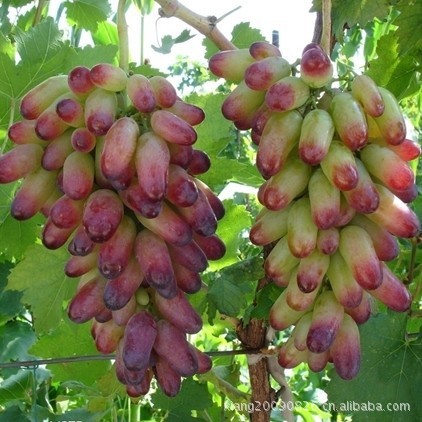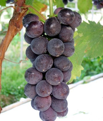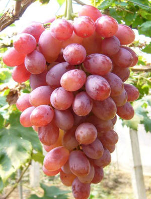 果穗大,平均穗重880克,最大穗重2300克。果粒卵圆形,果皮初熟时鲜红色,充分成熟时深紫红色,在重庆等多雨地区避雨栽培的情况下着色良好。果粒着生中等紧密,平均粒重10克,最大粒重15克。果实不裂果,不掉粒,耐贮运。果皮中等厚,果肉硬而脆,能削成薄片;肉质细腻,可溶性固形物18%~22%,味浓甜,风味甚佳,品质极上。果刷大而长,果粒着生极其牢固,特耐贮运,长途运输不脱粒,冷库可贮到来年4月,仍保持新鲜。每果含种子2~3粒。单株产量高,二次挂果能力强。