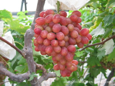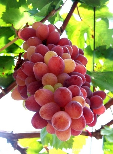 秋红葡萄:圣诞玫瑰葡萄又名“秋红”,欧亚种。原产美国,用S44-35C×1170杂交育成。该品种突出优点是抗病能力、抗逆性和丰产性均超过美国红提。嫩梢紫红色有稀疏茸毛。幼叶绿色,光滑乖毛。成龄叶较大,心脏形,5裂,上裂刻深,下裂刻中或浅,主脉分叉处向上突起,叶正背两面均光滑无毛,叶缘锯齿较锐,叶柄洼窄拱形,叶柄中长,紫红色。1年生枝深褐色,节间中等长,节与节之间呈“之”字形曲折。两性花。