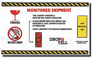 The warning labels are modern item for logistics damaging prevention , have -“Drop n Tell” .It is a sensible mechanical product without any magnetism and chemistry.It is to sticked on the carton to be transport , and the arrow on “Drop n Tell” will be shown red if the carton has been dropped or other improper handling, and to indicate to the officer have to check the carton which may be damaged. And the acted “Drop n Tell” is not resetting . As “Drop n Tell” have protection lock itself,so it will not active before its’ application. There are 6 models of sensor to meet any carton size and weight.