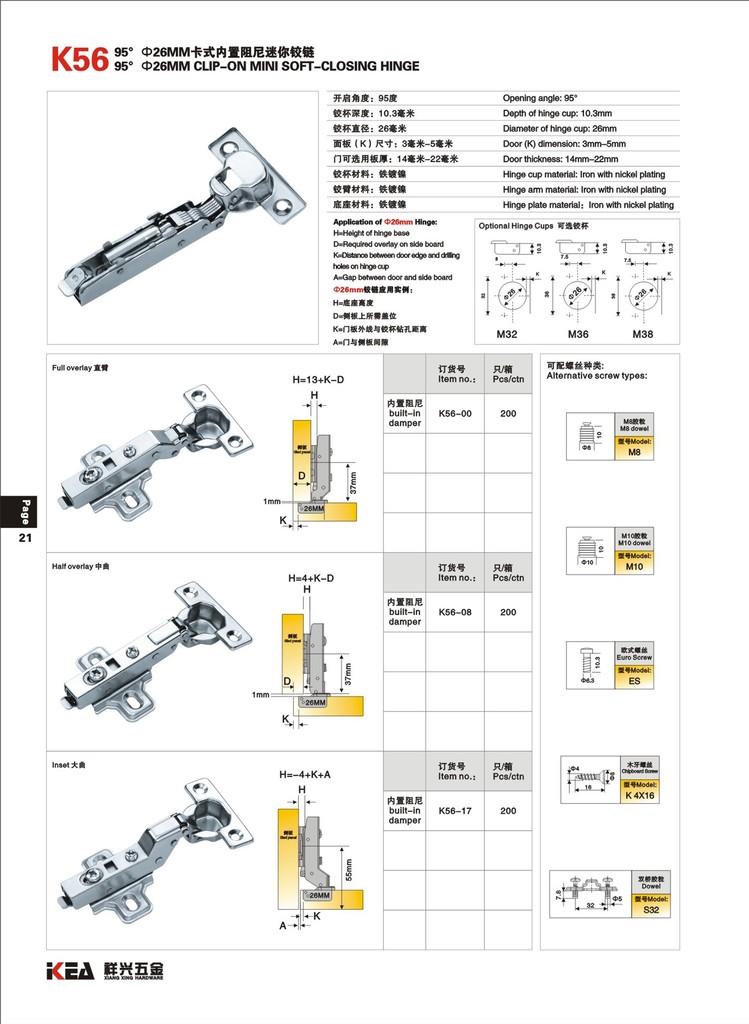 K56 95°Φ26MM卡式内置阻尼迷你铰链