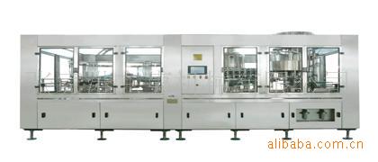 RCGF32/32/10型PET瓶洗瓶/灌装/封盖三合一机是我公司结合国际上先进的热灌装工艺技术自主研制开发的适用于果汁饮料、茶饮料热灌装的先进机型。该机采用瓶颈输送方式,只需更换极少变更件,就可适用于多种瓶型,消除了对瓶身的磨损,输送平稳。灌装方式为微负压重力灌装,独特的灌装技术不仅提高了灌装速度及灌装精度。同时避免了灌装过程中气泡的产生。卫生级的循环系统精确保证产品灌装时的温度,对产品的质量提供了可靠的保证。从法国引进的即抓即旋盖技术处于国内领先水平。萃取、配料混合后的茶水或果汁经UHT(超高温瞬时灭菌)系统,达到工艺要求后,由泵送至灌装机的灌装桶,此时不进行灌装,茶水继续回流到回流罐,如温度检测没达到工艺要求,茶水回UHT系统重新加温,回流罐中的温度检测达到工艺要求后,则进行灌装。灌装时开启真空泵,调节真空球阀,使回流罐中的负压达到工艺要求,在回流罐中设有液位检测,当液位超出高液位时,回流泵工作,将茶水泵回UHT系统,至低液位时,回流泵停止工作。进行CIP清洗时,UHT停止工作,将灌装阀装上假瓶,清洗液(酸液、碱液、清水)仍从灌装机进液口以1~2Kg/cm2的压力进入高位罐,分配缸,压入灌装阀,再经灌装阀压入下料缸,然后压入回流罐,最后压入CIP清洗机。其间可以启动回流泵,经回流罐顶部的清洗球对回流罐进行循环清洗