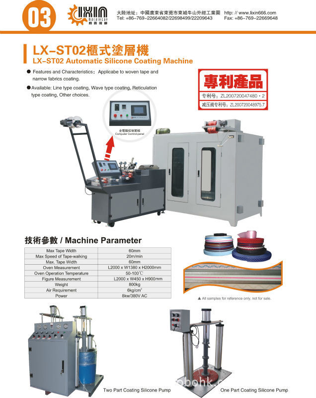 适用于纺织品、织带、丝带、提花带、弹力带、包边带、缎带、织唛、织标等各种带面的透明或调配任何颜色的点胶、铺胶、滴胶;厚薄、宽窄等进行调节,可实现4条同时作业。