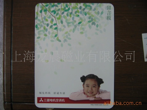 4)磁性留言板 白板:采用软磁(或纸板)+铜版纸四色印刷+PP复光膜+可擦笔.