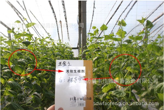 2011年12月18日,在寒亭高里西王庄王金知的黄瓜的大棚内使用根基宝灌根,设有对照。2011年12月22日(四天后)实地拍摄效果,左边(对照组)为使用其他生根剂效果,右边(示范组)为使用根基宝效果。