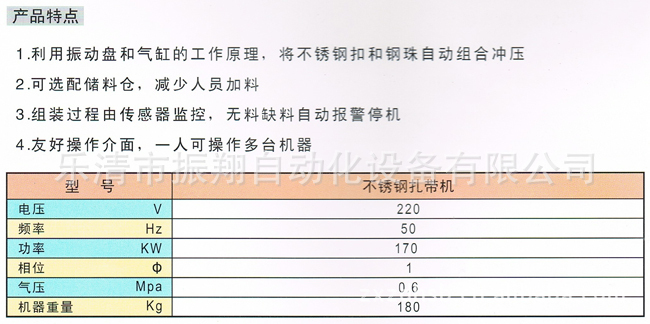 乐清市振翔自动化设备有限公司是一家集设计,开发,生产,销售和服务体的自动化设备生产企业。公司创建于2004年,近年来,公司在广大客户的热心支持下,规模不断扩大,现拥有员工30多人,其中技术员有20多人。拥有多年从事自动化设备设计,开发,制造的经验。客户遍及全国,乃至世界,公司产品曾多次出口到欧洲(土耳其),中东(伊拉克,伊朗)等国。产品主要有:钢钉线卡组合机,接线柱拧(退)螺丝机,不锈钢扎带自动冲压机, 端子焊接机, 压线帽组合机 ,接线柱丝功机,电缆防水接头组合机, 端子焊接机, 振动盘等,同时可根据客户要求,设计开发自动化非标设备。广泛用于电子,电器,五金,塑胶,文具,玩具,医疗,食品等行业。公司本着“追求品质,永无止境”的企业方针,把“提高产品合格率,提升客户满意度”为动力,在创新中求发展。始终本着“质量第一,顾客至上”的原则,以“创新、求实、诚信、拓展”为企业精神,以“诚信为本”的经营理念服务客户,赢得了广大客户的支持。秉承追求服务理念。从设计出发,生产制造到售后服务,以专业的技术、一流质量、人来函考察,洽谈业务! 服务于各行业。我们真诚期望与您携手共进,共创辉煌!欢迎来人考察洽谈业务!
