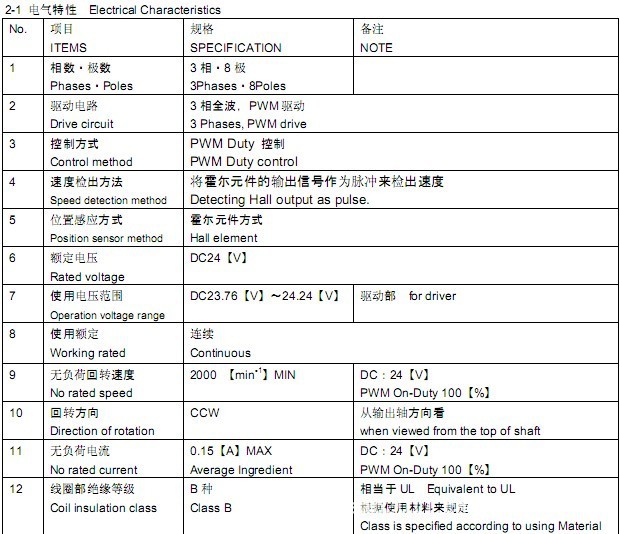 风扇用直流无刷电机,电压:24V; 功率:20W; 空载转速:2000rpm; 噪音:45dB以下; 使用寿命:20000h以上。具有使用寿命长,效率高,噪音低等特点。