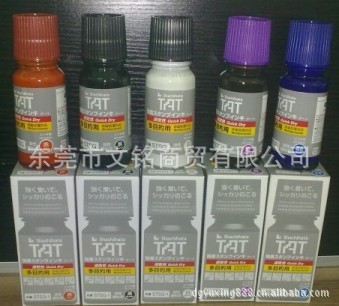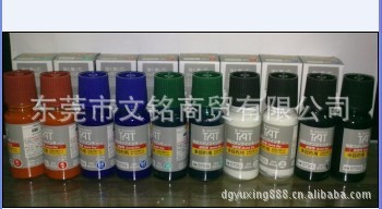 日本旗牌TAT万能不灭印油(快干型)使用指数:★★★☆性价比:★★★☆★品名:SHACHIHATA旗牌TAT万能不灭印油 ★产地:日本★型号:STSG(通用型快干印油)、STSM(金属用快干印油)、STSP(塑料用快干印油)★规格:型号-1为55ML/瓶,型号-3为330ML/瓶★包装:12瓶/小盒(55ML小瓶装),1瓶/盒(330ML大瓶装)★颜色:红、黑、蓝、白、绿★使用方法:挤印油少量多次均匀涂刷于万能不灭印台表面 ★使用范围:用于金属、塑胶、皮革、非吸墨性纸张、光面纸、亚克力、PVC、布、木材、玻璃、陶瓷、精细电子元件表面,覆塑膜的包装盒、塑料袋等非吸收性表面盖印。作商品批号、检验、出厂日期、有效期限等标识印字。★优点:①性价比较高(印迹不易擦掉,比利百代,狮牌印油效果好,价格略高)②印迹清晰不褪色(耐水洗,耐摩擦,耐低度酒精清洗)③环保(本产品对应RoHS指令合格,附最新SGS环保报告,无卤素报告,品质可靠)④墨干速度快,适用于流水作业☆缺点:①印油本身挥发快,使用过程中要注意适量取用,切勿造成浪费。(需使用万能不灭印台,可选用旗牌原装万能不灭印台ATMU-2等,也可选用我公司改装的不灭印台)