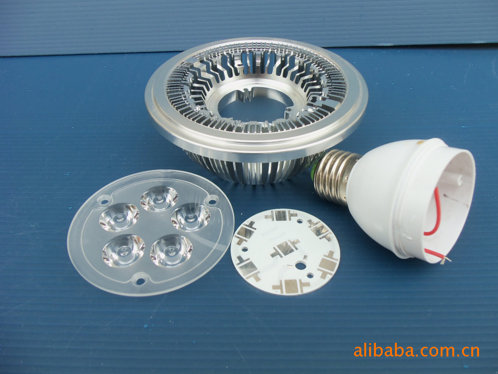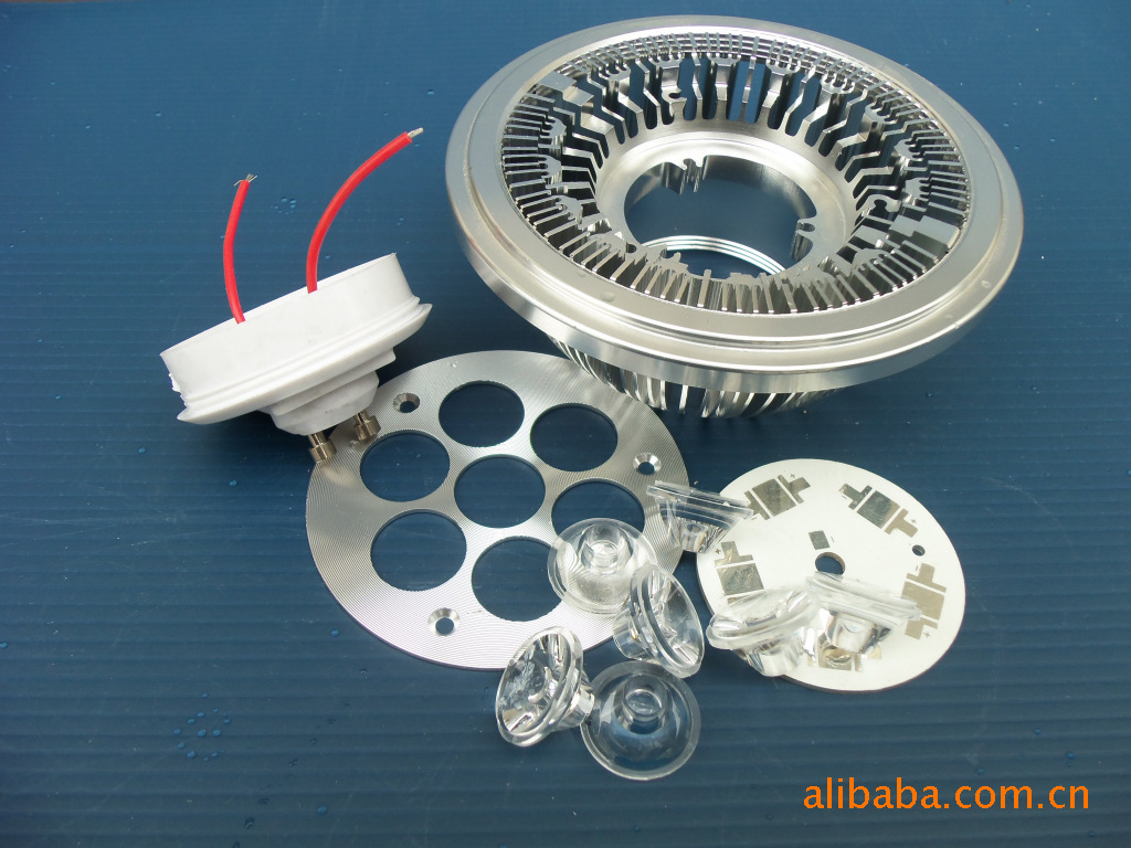 灯杯、面盖、透镜、灯头(E27、E26、GU10、MR16、E14、E17灯头任选其一)、支架、螺丝、铝基板。